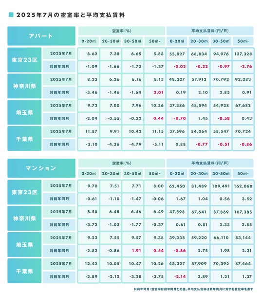 ■2025年7月の空室率と平均支払賃料および前年同月比
