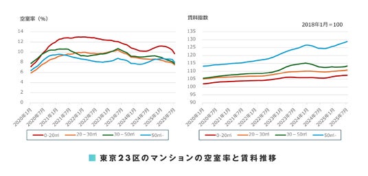 総務省の「住民基本台帳人口移動報告」によると、新型コロナウイルスの感染拡大で減少した東京 23 区への人口流入超過は 2021 年後半から 2024 年前半にかけて増加傾向で推移しました。その後、転入超過は減少傾向となっています。対して、貸家着工戸数は概ね横ばい傾向で推移しています。前月(2025 年 6 月)に、アパートの 0-20 平方メートル 、マンションの 50 平方メートル -で前月比横ばい、その他の面積帯では前月比で僅かながら悪化となりましたが、これは転入超過の減少(需要の減少)が影響していると考えられます。2025 年 7 月は、東京23 区のアパート・マンション共に、全面積帯で前月比の空室率が改善しましたが、今後の動向には注意が必要です。募集賃料が大きく上昇していることから、テナントの入れ替えや賃料改定により平均支払賃料(以下、支払賃料)もアパート・マンション共に全面積帯で前月比上昇しました。ただし、マンションの支払賃料の上昇は、50 平方メートル -を除き小幅にとどまっています。また、アパートでは全面積帯で前年同月比下落しており、家賃の高い物件が敬遠され始めている可能性が考えられます。