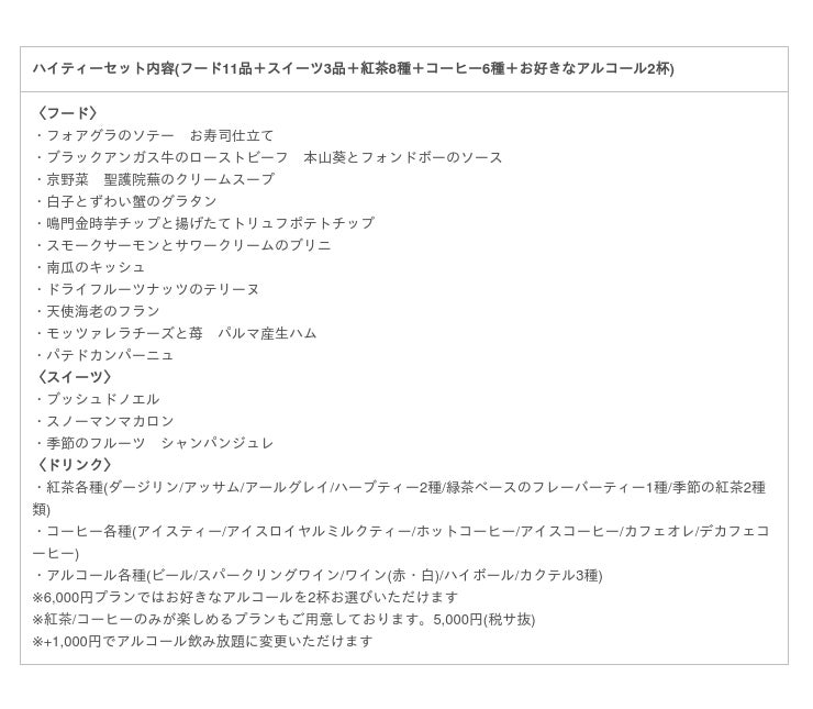 ・ハイティーセット+アルコール2杯付き(フード11品+スイーツ3品+紅茶8種+コーヒー6種+お好きなアルコール2杯) 6,000円(お一人様/税サ込)
