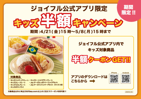 ファミリーレストランのジョイフル((株)ジョイフル 本社:大分県大分市 代表取締役社長:穴見くるみ)は、2023年4月21日(金)15時より、「ジョイフル公式アプリ」の会員様限定で該当のキッズメニュー商品が半額にてご利用いただける「キッズ半額キャンペーン」を実施いたします。