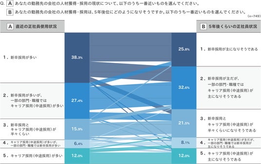 ⇒これらの結果から、新卒採用とキャリア採用を組み合わせた採用構成へと移行する企業が増える可能性が示唆されるものの、新卒採用とキャリア採用のどちらに重きを置くかは企業によって多様化するのではないか。