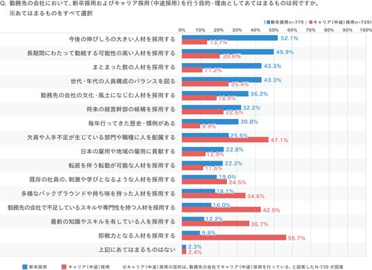 ⇒この結果から、新卒採用は将来の成長や長期的な活躍を期待した人材確保の手段として位置づけられる一方、キャリア採用は即戦力や専門性の補完など、足元の人材ニーズに対応する採用として活用されていることがうかがえる。