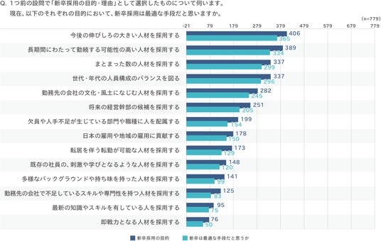 ⇒これらの結果から、新卒採用は将来的な成長や長期的な活躍を期待した人材確保の手段として認識されている一方、専門性や即戦力を求める採用については別の採用手段が用いられる傾向がうかがえる。