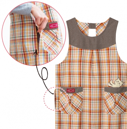 「チェック柄ネコ付きエプロン(サイドホール付き)」▶