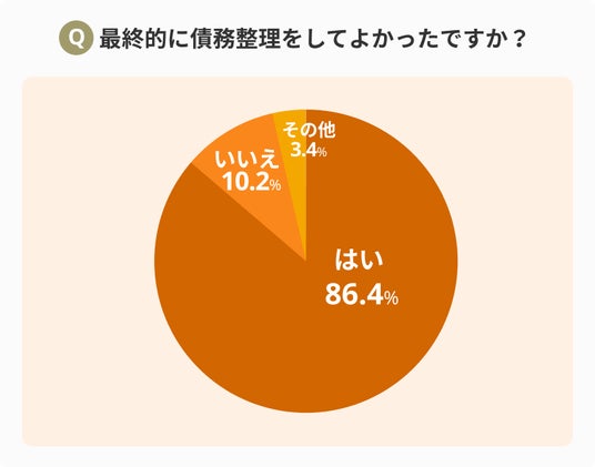- 債務整理をした方の内、86.4%は「債務整理をしてよかった」と回答した。