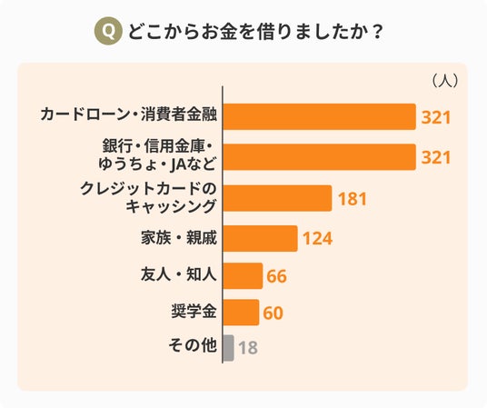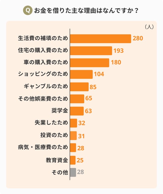 借金をしたことがある780人に対して「お金を借りた主な理由はなんですか?」と質問したところ、280人が「生活費の補填のため」と回答し、1位となりました。次いで「住宅の購入費のため」が193人、「車の購入費のため」が180人と続き、いずれも必要に迫られた借金であることがわかります。他方、「ショッピングのため」、「ギャンブルのため」、「その他娯楽費のため」が続き、遊興費としてお金を借りる方も一定数いることがわかりました。また「どこからお金を借りましたか?」と質問したところ、「カードローン・消費者金融」が321人、「クレジットカードのキャッシング」が181人となり、回答件数1,091件中の46.0%が貸金業者を利用して、借金をしていたことがわかります。これらの業者は、スマートフォンや専用ATMで、手軽かつ短時間で手続きが可能なため、生活費を補填するための利便性は高い反面、利用状況を細かく確認し、返済計画を立てないと多重債務に陥ってしまう可能性があります。