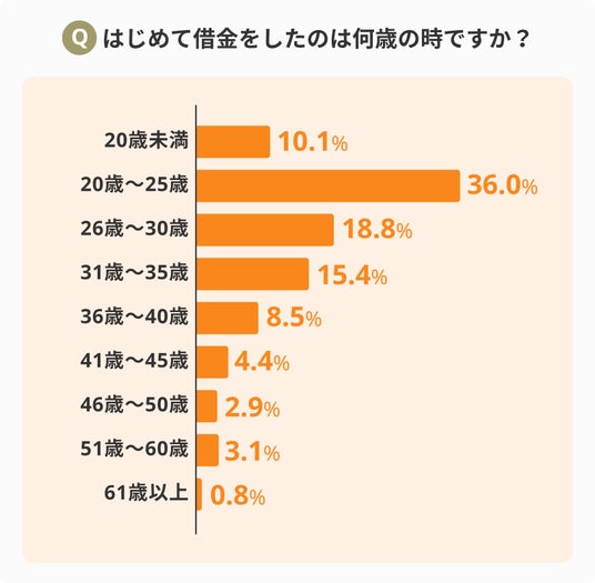 また、借金をしたことがある780人に対して「はじめて借金をしたのは何歳のときですか?」と質問したところ、「20歳未満」「20歳~25歳」「26歳~30歳」と回答した方の割合は合計で65.0%となり、半数以上が20代までに借金をしていたことがわかりました。