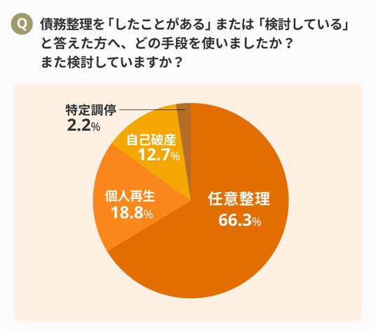 また「自身が債務整理をしたことがある」、「債務整理をしたことはないが、知っているもしくは検討している」と回答された方に、債務整理の中でもどの制度を使用したか、またはどの制度の使用を検討しているか質問したところ、66.3%の方が「任意整理」と回答。