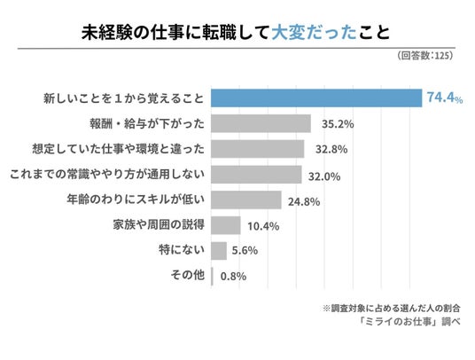 「転職で大変だったこと・苦労したこと」として、全体の約4分の3にあたる74.4%が「新しいことを1から覚えなければならなかったこと」と回答し、ダントツの1位となりました。業務スキルだけでなく、基本的なビジネスマナーやPCスキルに苦労したという声も。