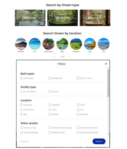 文化的な背景から“他人と裸同士での入浴に抵抗感がある”と感じる外国人も多く、そういった方向けに「プライベート温泉」や「部屋風呂」などの切り口からも検索できる導線を設計。その他、ロケーションや浴衣レンタルの有無、支払い方法など、どんな滞在にしたいかの希望や、懸念点など訪日外国人ならではの目線から多様な検索軸での絞り込みが可能です。