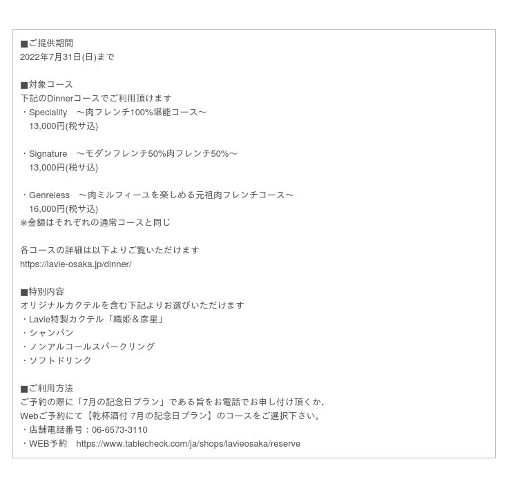 GLIONグループ(ジーライオングループ 所在地:兵庫県神戸市)は、同グループが運営する大阪築港・赤レンガ倉庫のLA VIE 1923にて2022年7月より、月替わりの「記念日プラン」をリリース致します。今月は七夕の織姫と彦星にちなんだオリジナルカクテルでの乾杯酒付きプランをご提供致します。