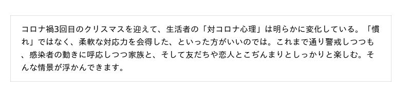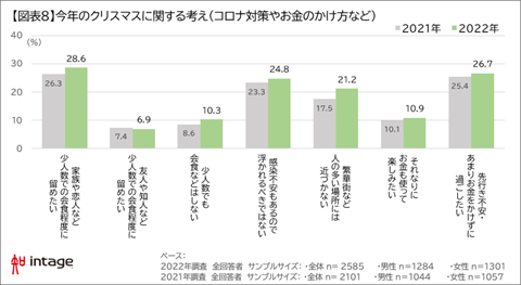 今回のアンケート結果によって贈り物や食事会・パーティ、旅行といったクリスマス関連に支出したいと考えている金額は、昨年を上回る予算を想定している様子が浮かびました。そこには今年こそはクリスマスを楽しみたい、という生活者の期待が表出しているように映ります。しかしながら、「第8波」の最中であり、まだまだ警戒心も根強く残る中で、引き続き感染予防には配慮しつつ、という複雑な心理状況も浮き彫りになっていると考えます。