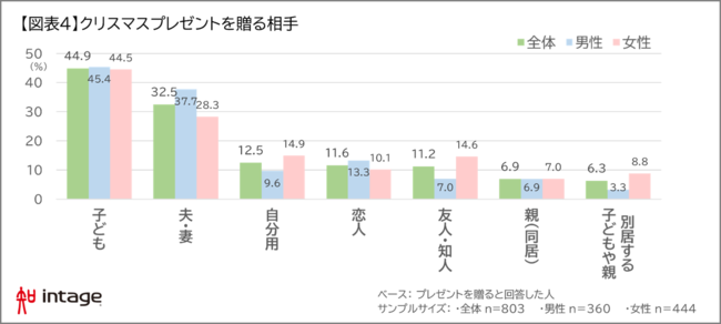 クリスマスのプレゼントを贈る相手を聞いたところ、「子ども」が45%と最も多くなっていました。次いで「夫・妻」が33%となっており、クリスマスが子どもを中心とした家族での大切なイベントになっていることがわかります。それ以外の回答に目を向けると、「自分用(13%)」、「恋人(12%)」、「友人・知人(11%)」がほぼ同水準で続いています。昨今、クリスマスに一年間がんばってきた自分向けにご褒美プレゼントを、といった特集や広告をあちこちで見かけます。そうしたトレンドの定着を裏付ける結果となっています。【図表4】
