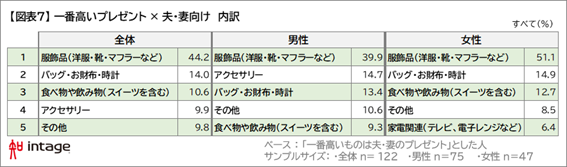 「夫・妻向けのプレゼントに一番お金をかける」と答えた人に予定しているものを尋ねたところ、男女ともに「服飾品」が44%と最も高く、服飾品の購入予算の平均金額をみると10,778円となっていました。男女別にみると、男性から妻へのプレゼントは12,433円、女性から夫は8,708円と男性の方が3,725円高くなっています。また、「その他」の内訳を詳しく見てみると台所用品や美容関係といった実用的なものから、現金やギフトカードといったものもありました。【図表7】