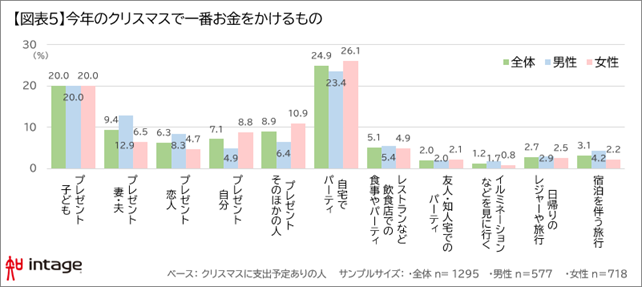 今年のクリスマス関連のイベントで一番お金をかけるものについて聞いたところ、「自宅でのクリスマスパーティ(25%)」が最も多くなっており、「子ども向けのプレゼント(20%)」が続く結果になっていました。最近では有名店からのお取り寄せをはじめ、ケータリングサービスやフードデリバリーなども充実しています。また、デパートなどで少し贅沢な食材やスイーツを買い込んで、というスタイルも人気です。ご自宅でどのような楽しみ方をするのか気になりますね。【図表5】