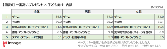 一番高いプレゼント、子どもには「ゲーム」、夫・妻へは「服飾品(洋服・靴・マフラーなど)」が一番人気