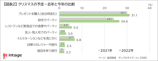 具体的なクリスマスの予定については「プレゼントの購入(自分用を含む)(31%)」や「自宅でのパーティ(27%)」が他を大きく引き離してツートップ状態に。また、昨年のクリスマスの過ごし方と比較すると、今年はどちらもわずかながらも増加していました。昨年のクリスマスシーズン(11~12月)を振り返ると、1日の新規感染者数は200名程度と落ち着いた状況でした。今年のクリスマスは第8波の渦中とはなりそうですが、「レストランなど飲食店での食事やパーティ」「友人・知人宅でのパーティ」もそれぞれ微増していることから、コロナ下にあっても、「マスクなどの感染対策を継続しつつ外出や外食も楽しむ」という世相を反映した結果になっていると考えます。【図表2】