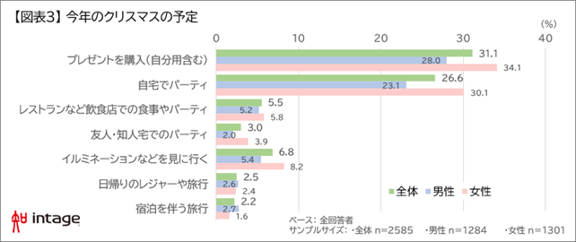 男女別でみても、「プレゼントの購入」、「自宅でのパーティ」のどちらも男性より女性の方が予定者が多くなっています。また、「イルミネーションを見に行く」も女性に人気のようです。今年は都内をはじめ、これまで中止にしていたイルミネーションの名所も復活しているところも多いことから、クリスマスならではの街の風景を今から心待ちにしているかもしれません。【図表3】