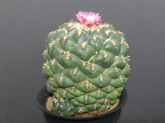 仏様の頭のような姿の頂点になんとも愛らしいピンクの花を咲かせるサボテン(ハート) 本来の象牙丸はメキシコ・ミチョアカン州が故郷の丸いサボテンで、名前の通り象牙のような色をした刺を付けます。この象牙丸にはいろいろなタイプがあり、中には本種のようにうんと刺が短く愛らしい姿をしたものが生まれることもあるのです(実物は大きいですよ!)花の咲くところに白い綿毛のようなものが生えます。頑丈ですがダニがついて色が悪くなることがあるので、育て方には注意がいります。