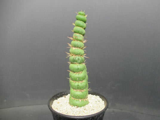 まるで、ねじり飴!これでも立派なサボテンの仲間です。「恐怖閣(キョウフカク)」という名前の通り、いかついトゲをしたチリ南部パタゴニアに自生している柱サボテンが、成長点の突然変異により石化(せっか)という現象を起こしてこのようなサボテンらしからぬユニークな姿に成長しました。ムチムチした円盤のような姿の隙間に黄色いピンピンとした刺がなんとも愛らしい♪流通量が少なく、中々お目にかかれない珍品です!