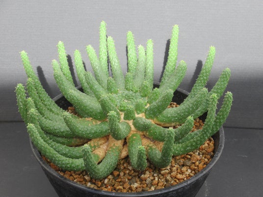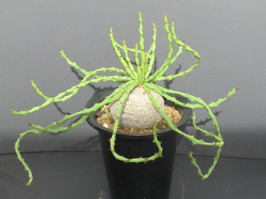 名前にふさわしい迫力のある姿!真ん中の丸い部分からまるでタコの足のように太くがっちりとした枝を放射状に出します。このような植物をマニアの間では「タコモノ」!と呼び、人気を博しています(よく見るとかわいい姿かも♪)。南アフリカ東ケープ州の開けた平原部の草原地帯や、山裾に自生しています。成長すると直径40~50cm程の大きさに成長します(大ダコ?)。グリーンの枝の表皮は亀甲状の爬虫類の皮膚のような姿で覆われ、一段と凄みのある雰囲気を醸し出しています。