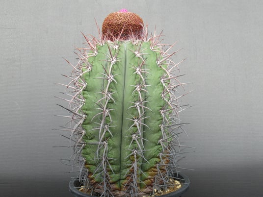 ベネズエラのカリブ海に浮かぶマルガリタ島という島が故郷の球サボテン!頭の上にはまるでトルコ帽子のような花座(セファリゥム)という花を守るために存在する部分があります。この花座からは星のような姿をした、小さいけれどもピンク色の鮮やかな花が咲きます♪今まで「おもしろサボテン品評会」に出てきたメロカクタスの中では最も大きな株で、高さが30cmくらいあります(トルコ帽が小さく見える!)。その姿は迫力満点!寒さには弱いので冬の管理に気を配ります。