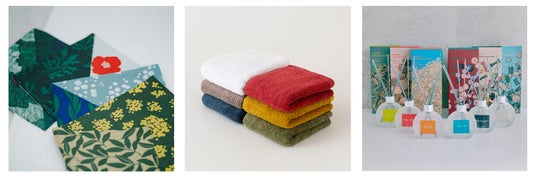 (左から)地域産業との協業でうまれた「播州ハンカチ」、環境配慮の側面が評価された2024年度グッドデザイン賞を受賞の「フラッフィータオル」、ミステリアスな香りの無水タイプの「ディフューザーシリーズ」