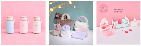(左から)マットなミルキーカラーのロゴ入りステンレスボトル、バイカラーがポイントのエコファーシリーズ、大人も夢中になる可愛さのミニチュアシリーズ