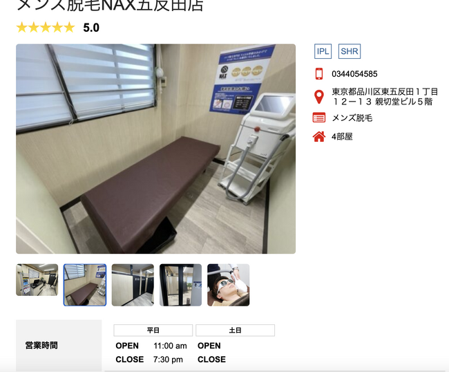画像は施術ルーム2部屋、セルフ脱毛2部屋、計4部屋完備のNAX五反田店。