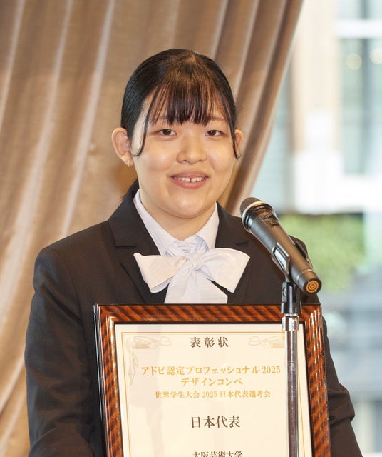 大阪芸術大学(学校法人塚本学院/所在地:大阪府南河内郡/学長:塚本邦彦)デザイン学科3年生の堀江志歩(ほりえしほ)さんが、「アドビ認定プロフェッショナル世界学生大会2025」の日本代表に選ばれました。2025年6月4日(水)、東京會舘にて「MOS/アドビ認定プロフェッショナル世界学生大会2025 入賞者表彰式&日本代表発表会」が開催され、日本代表に選ばれた堀江さんは喜びと今後の意気込みを語りました。堀江さんは今年7月27日(日)からアメリカ・フロリダ州オーランドで開催される決勝戦に出場します。