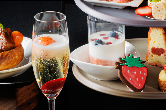 またウエルカムドリンクとして、フレッシュの苺とピューレ状にした苺を氷にし、スパークリングワインを注いだ1杯をご用意します。旬の食材を使った14種のメニューが楽しめるティースタンドとメインディッシュとともに、楽しいお食事時間をお過ごしください。
