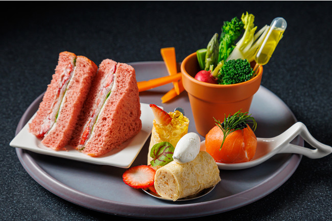 中段には植木鉢の器に入れ、ツナとアンチョビのソースでいただく、「旬のスティック野菜」や、苺、生ハム、クリームチーズを挟んだ「サンドウィッチ」、塩味、甘み、酸味のバランスが絶妙の「苺を添えたポークリエット」、黒い真珠と呼ばれるアブルーガをアクセントに、ポテトサラダをスモークサーモンで巾着状に包んだ「スモークサーモンのオモニエール」がお召し上がりいただけます。