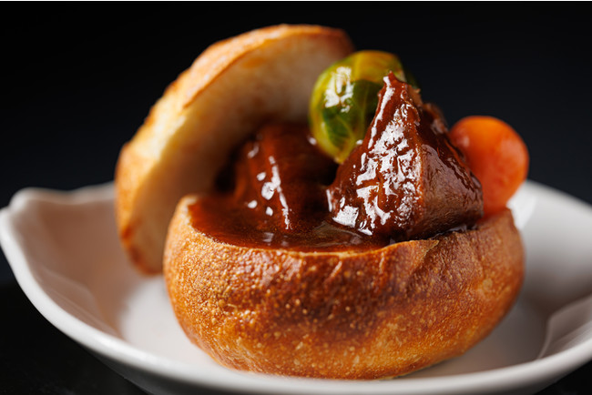メインディッシュには、肉質が柔らかく脂があっさりとした特徴を持つ大阪産黒毛和牛の“なにわ黒牛”を使い、程良く肉の食感を残しつつ、赤ワインでじっくりと煮込んだシェフ自慢のシチューを、小麦粉の甘みを引き出し、しっとり柔らかな桐生酵母パンの器に入れご提供いたします。