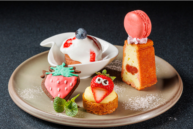 苺の“ワクワク”メロンパン 流れるヨーグルトソース/スマイル苺をのせた塩サブレ/苺のドライフルーツ入りパウンドケーキ/苺のマカロン/苺に見立てたアイシングクッキー
