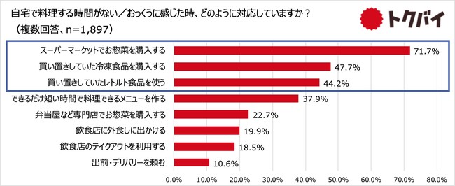 料理をする時間がなかったりおっくうに感じた際にどのように対応しているかをたずねたところ、「スーパーマーケットでお惣菜を購入する」との回答が71.7%で最多となりました。このほか、「買い置きしていた冷凍食品を使う」が47.7%、「買い置きしていたレトルト食品を使う」が44.2%となりました。