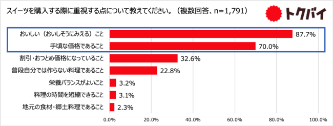 スーパーマーケットでスイーツを購入する際に重視するポイントについてたずねたところ、「おいしい(おいしそうにみえる)こと」が87.7%で最多となり、次いで「手頃な価格になっていること」が70.0%となりました。お惣菜に比べ、スイーツを選ぶ際は価格以上においしさを重視する傾向にあることが伺えます。