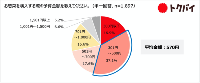 お惣菜の購入金額は「301円~500円」が37.1%で最多となりました。また、平均金額は570円となりました。