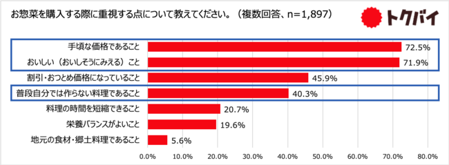 お惣菜を購入する際に重視するポイントについてたずねたところ、「手頃な価格であること」との回答が72.5%で最多となり、次いで「おいしい(おいしそうにみえる)こと」が71.9%で他の回答項目と大差をつけて上位に並びました。さらに、「普段自分では作らない料理であること」が40.3%となり、料理のマンネリ解消や購入ならではの楽しさなども求められていることが伺えます。