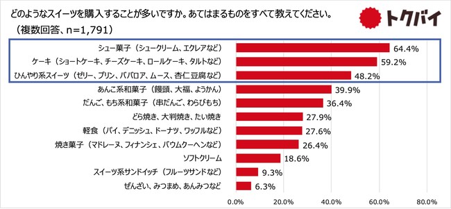 具体的にどのようなスイーツを購入するかたずねたところ、「シュー菓子」が64.4%で最多となり、次いで「ケーキ」が59.2%、「ひんやり系スイーツ」が48.2%となりました。シュー菓子は手頃な価格で程よくお腹が満たされるため、間食だけでなく食後のデザートなど、他のスイーツと比べて選ばれるシーンが多いこともあり、人気が高いことが伺えます。