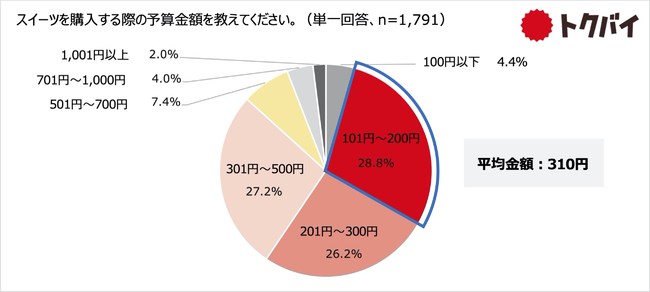 スイーツ購入予算は「101円~200円」が28.8%で最多となり、次いで「301円~500円」が27.2%、「201円~300円」が26.2%と僅差で並びました。また、平均金額は310円となりました。