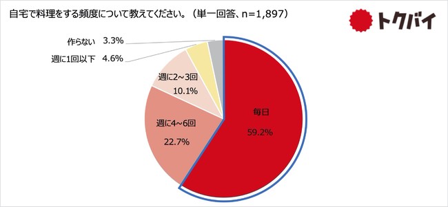 自宅で料理をする頻度についてたずねたところ、「毎日」との回答が59.2%で最多となりました。