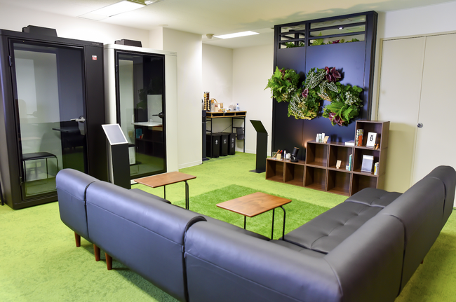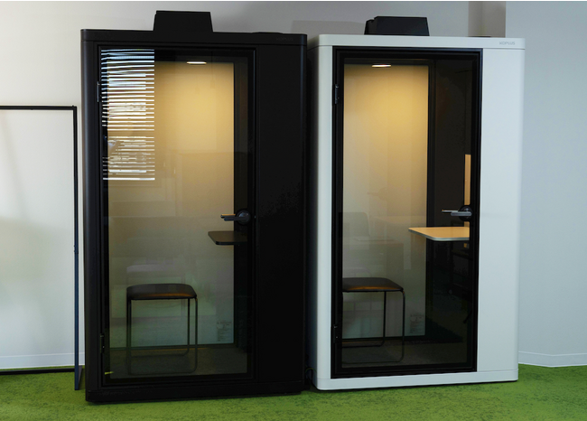完全個室のフォンブース(防音)。それぞれのブースに室内換気と電源を完備しているから安心です。WEB会議や長時間のお電話の際にご利用ください。
