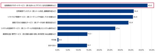 - 今後、自社に導入したいAIエージェントサービスでは、「従業員向けサポートサービス(社内ヘルプデスク、社内文書検索等)」が最上位。次に、「日常業務アシスタント」「ソフトウエア開発サービス」「業務プロセス自動化サービス」が続く