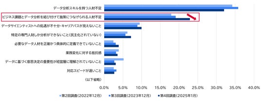 - DX人材の課題では、「データ分析スキルを持つ人材不足」が減少した一方で、「ビジネス課題とデータ分析を結び付けて施策につなげられる人材不足」が増加