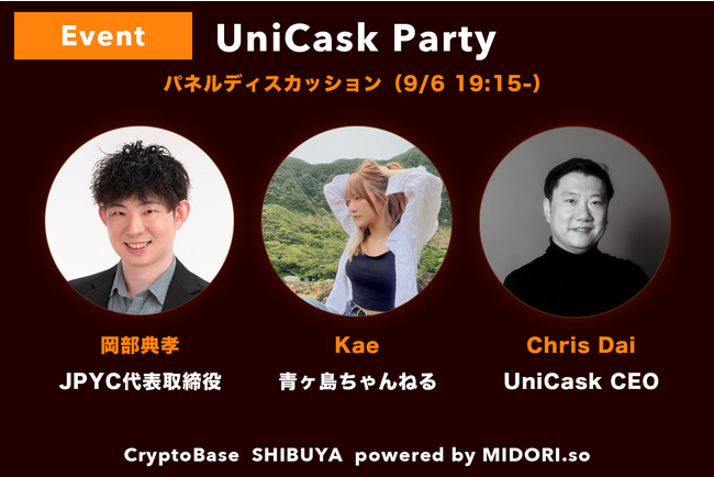日本円ステーブルコイン『JPYC』を取り扱うJPYC株式会社(東京都千代田区、代表取締役:岡部 典孝)は、9月6日、CryotpBase渋谷で開催されるイベント「UniCask Party」に登壇します。「離島×WEB3」をテーマにパネルディスカッションを行います。