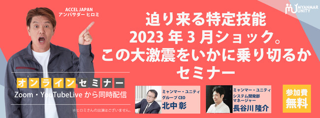 今回、迫り来る2023年3月ショックをどのように乗り切るかをご説明するため、ミャンマー政府認定No.1人材送り出し機関「ミャンマー・ユニティ」は、2月21日に「迫り来る特定技能2023年3月ショック。この大激震をいかに乗り切るか セミナー」を開催いたします。奮ってご参加ください。