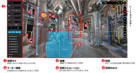 3次元情報をもった360パノラマ写真をベースに設備管理を容易にするための 3次元ビューアサービスです。製造プラントにおける設備管理業務へ活用できる機能を実装しています。
