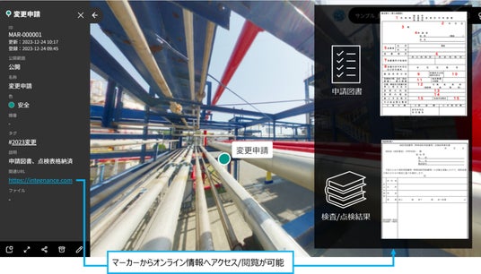 危険物施設等の許認可申請図書/定期点検記録のデジタル情報へINTEGNANCE VRのマーカー機能を活用する事で簡単にアクセス/閲覧する事ができます。