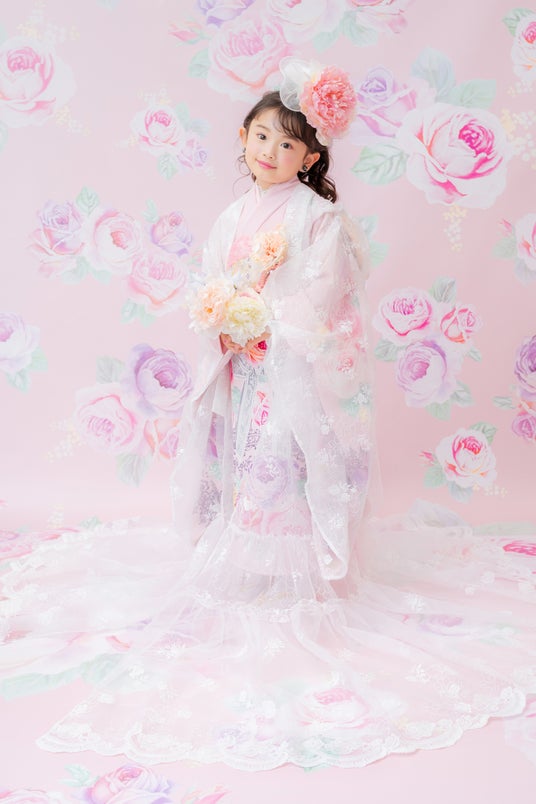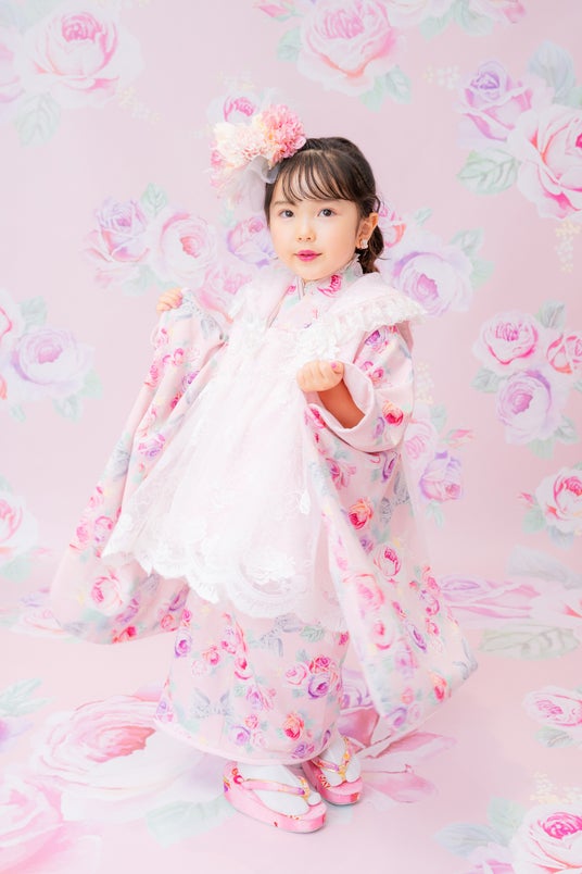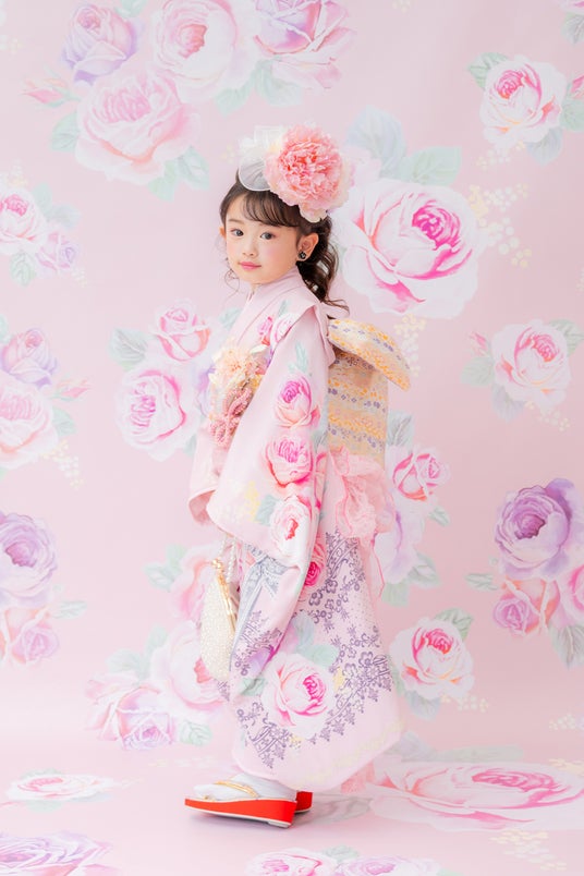 7歳の装いは、メゾ ピアノを象徴する花「薔薇」を繊細な大振りの手描きテイストで絵羽模様に。