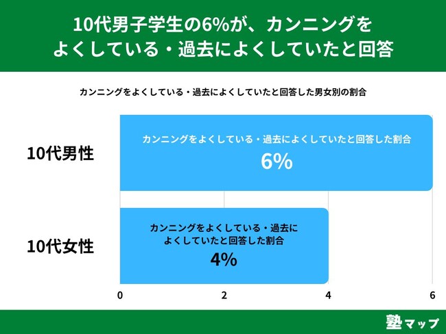 カンニングをよくしている・過去によくしていたと回答した割合を男女別でみてみますと、男性が6%、女性が4%という結果になりました。